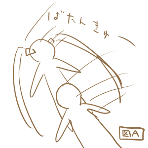 戦闘中にたまたまアスベルとソフィが一列になってて、そこで前から敵の攻撃くらってやられたんですが、倒れた後の格好が面白かったです。